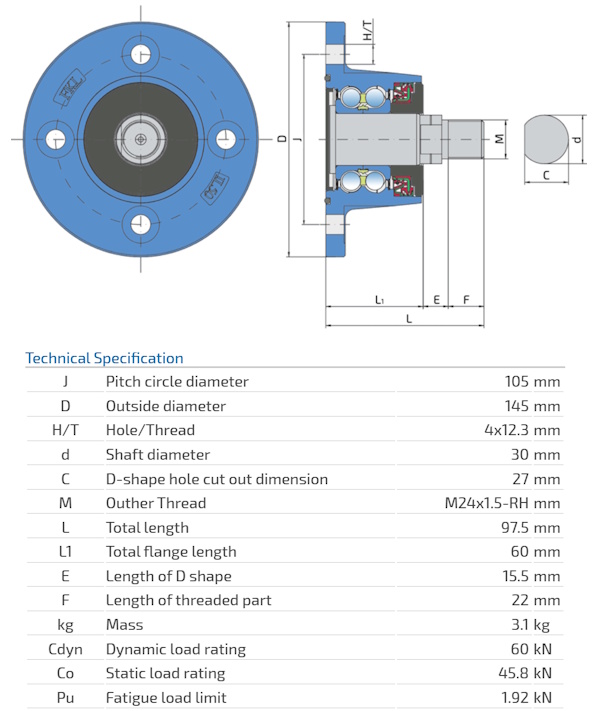 IL50-105/4H-M24x1.5-RH Integrated Flange, Maintenance-Free Bearing For Independent Discs Application: Disc Harrow Lemken 55510034