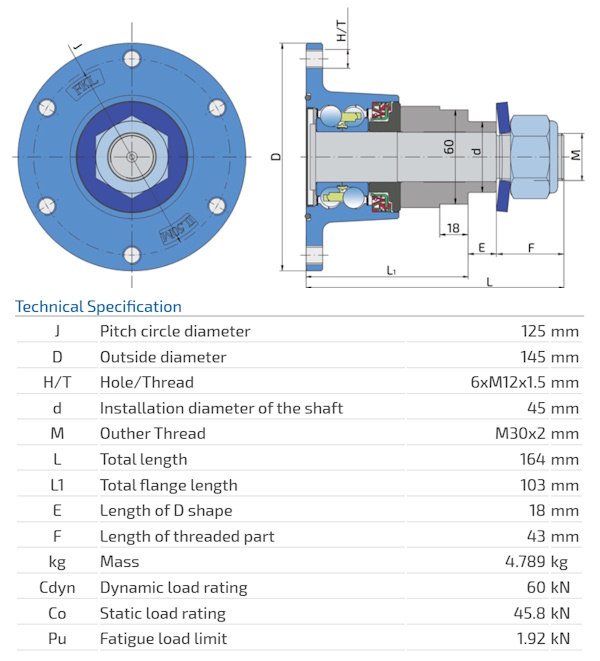 IL50-125/6T-M30x2-164 Integrated Flange, Maintenance-Free Bearing For Independent Discs Disc Harrow Horsch, 28283600, 28283500, 28288000