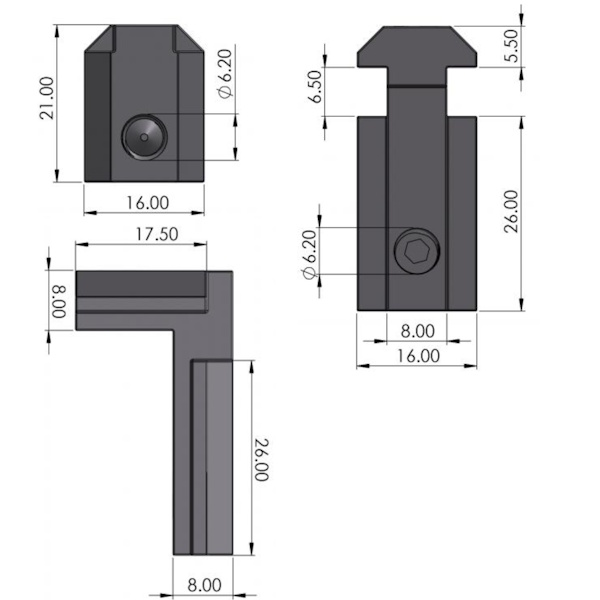 Tehniskie parametri: Tips - B Slot - 8 Izmēri 21x30x17mm Skrūvju vietu skaits - 2 (DIN914 skrūves iekļautas komplektā) Materiāls - Lietais alumīnijs Svars - 0,0235 Kg Paredzēts izmantot profilu savienošanai iekšējā stūrī.