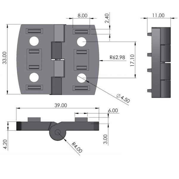 Enģe izmantojama priekš durvīm vai vākiem. Eņģei ir izvirzījums, kas ieguļās profila gropē un neļauj tai pagriesties.