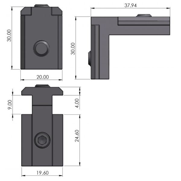 Tehniskie parametri: Tips - B Slot - 10 Izmēri 32x38x19mm Skrūvju vietu skaits - 2 (DIN914 skrūves iekļautas komplektā) Materiāls - Lietais alumīnijs Svars - 0,044 Kg Paredzēts izmantot profilu savienošanai iekšējā stūrī.